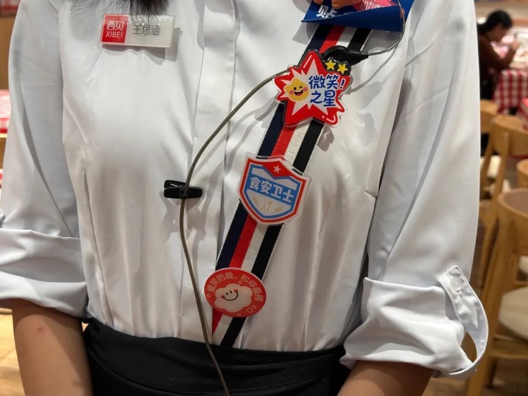 西贝门店佩戴“食安卫士”“微笑之星”徽章员工
